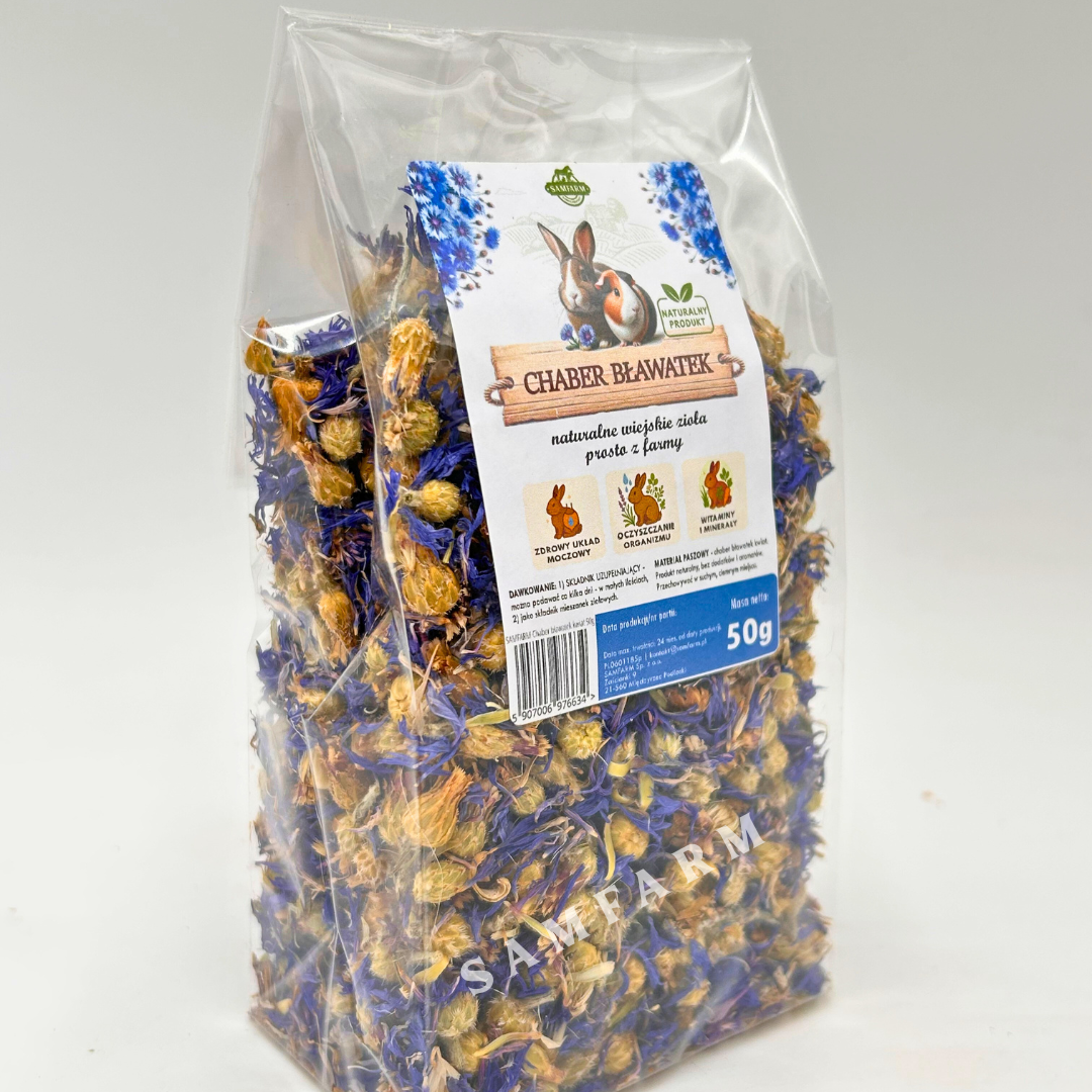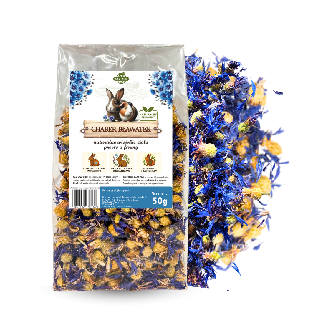 Chaber bławatek to cenny składnik diety królików i gryzoni. Działa moczopędnie, oczyszcza organizm z toksyn. Chaber udekoruje każdy posiłek Twojego pupila i dostarczy mu cennych składników odżywczych, między innymi flawonoidów oraz soli manganu i potasu.