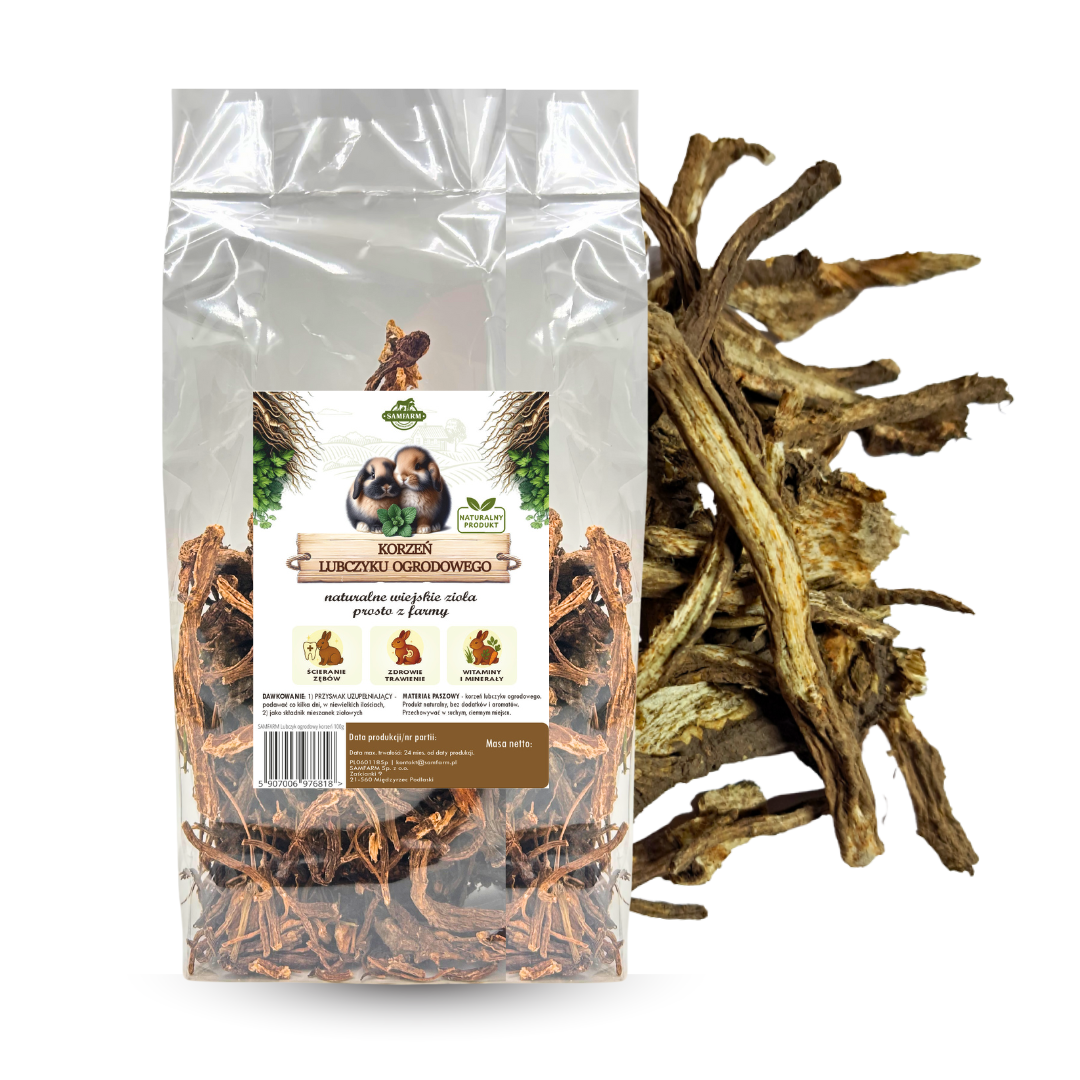 Suszony korzeń lubczyku ogrodowego – podstawowy gryzak i przysmak dla królików i gryzoni