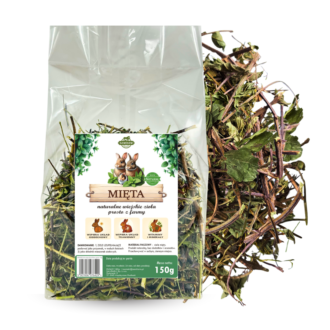 Skład: suszone ziele mięty – materiał paszowy (całe ziele, tzn. liscie + łodygi)