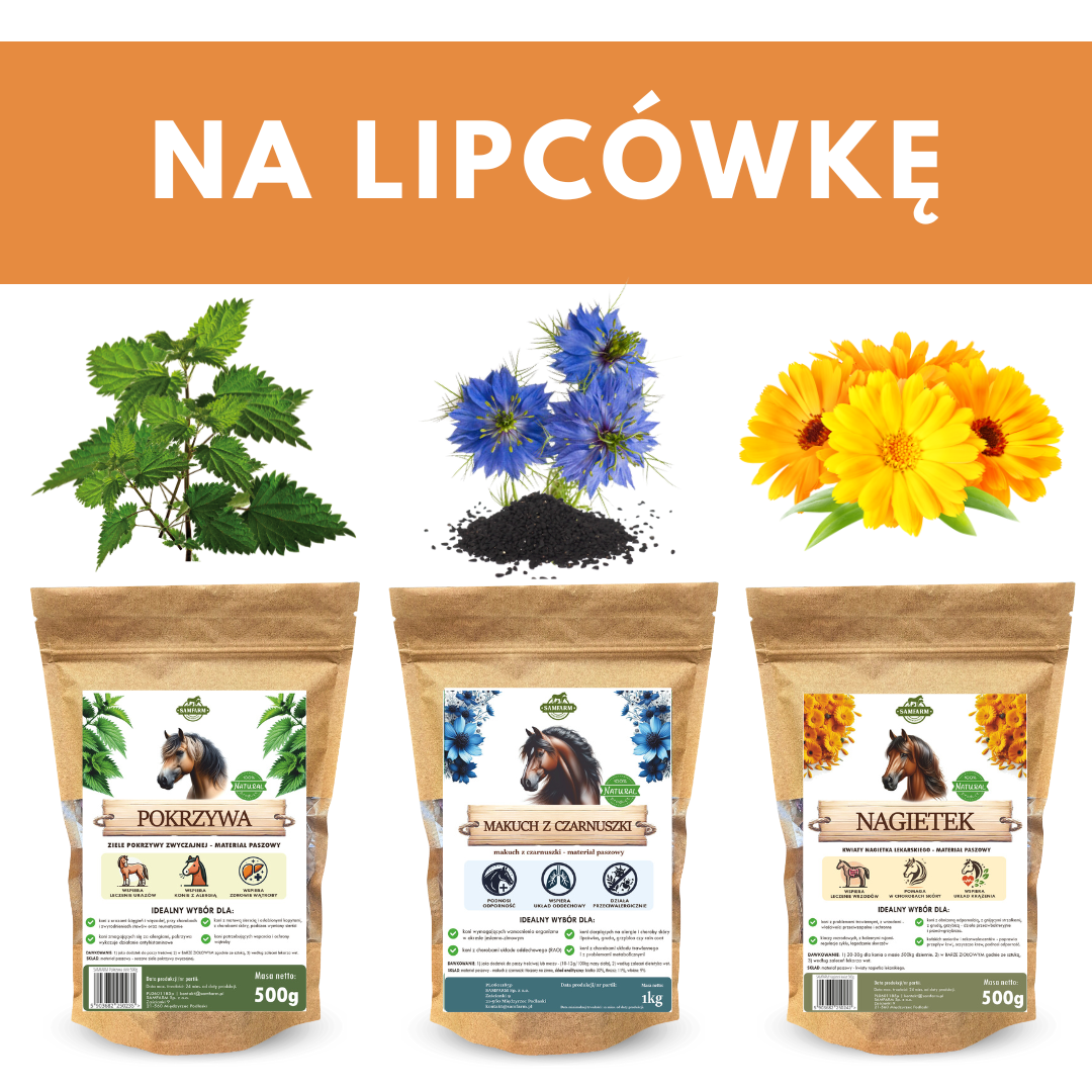 Przygotowaliśmy dla Was kompleksowy zestaw ziół i naturalnych składników, który wspiera organizm konia w walce z lipcówką – od środka. Działa przeciwzapalnie, wzmacniająco i łagodząco na skórę i układ odpornościowy.