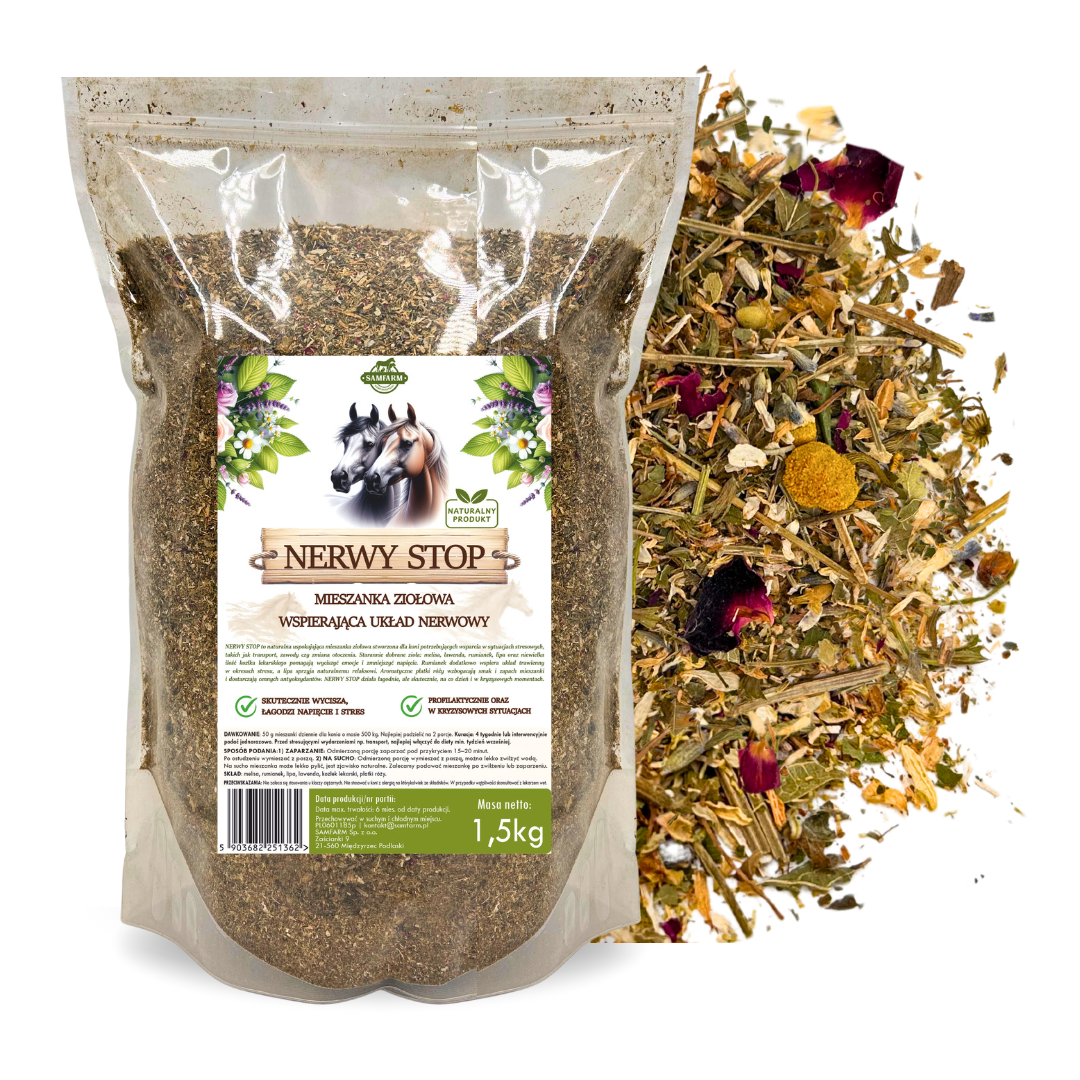 NERWY STOP to naturalna mieszanka ziołowa stworzona z myślą o koniach wrażliwych, reaktywnych oraz narażonych na stres związany z transportem, zawodami, zmianą otoczenia czy codziennymi wyzwaniami treningowymi. Oparta wyłącznie na starannie dobranych surowcach roślinnych, wspiera równowagę emocjonalną i pomaga koniom zachować spokój bez efektu otępienia.