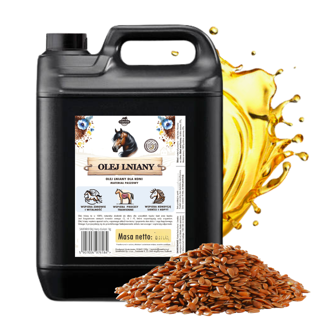 Olej lniany jest cenionym dodatkiem do diety koni ze względu na jego liczne korzyści zdrowotne. Olej lniany ma najkorzystniejszy stosunek kwasów tłuszczowych omega-3 do omega-6. Kwasy tłuszczowe zawarte w oleju lnianym przyczyniają się do wzrostu odporności, poprawy stanu sierści oraz kopyt, a także pozytywnie wpływają na regenerację po wysiłku. Z dobroczynnych właściwości oleju lnianego skorzystają konie borykające się z problemami trawiennymi, z wrzodami oraz problemami skórnymi, takimi jak lipcówka. Olej lniany wzmacnia róg kopytowy, nadaje też blasku sierści i dodaje kopytom elastyczności. Olej to świetny dodatek do diety dla koni i kuców w każdym wieku. Wspiera zdrowie, dodaje energii i witalności. Kwasy tłuszczowe zawarte w oleju wspierają także odporność i pomagają w zachowaniu zdrowia układu ruchu. To nieocenione wsparcie końskiego zdrowia o każdej porze roku.