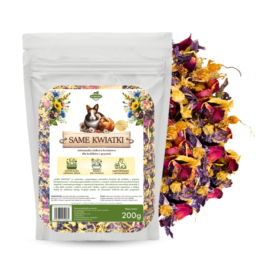 Mieszanka „Same Kwiatki” to wyjątkowy dodatek do diety królików, który można podawać jako samodzielny przysmak, dodatek do ziół lub dekorację posiłku. Naturalna, aromatyczna i pełna wartościowych składników – idealna dla każdego uszaka!