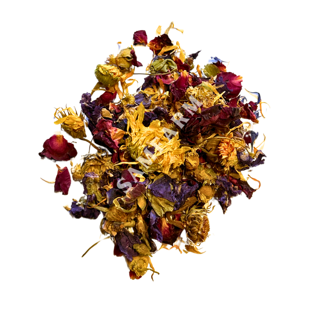 Skład: kwiat chabra bławatka, kwiat rumianku pospolitego, kwiat nagietka lekarskiego, kwiat róży, kwiat ślazu dzikiego.