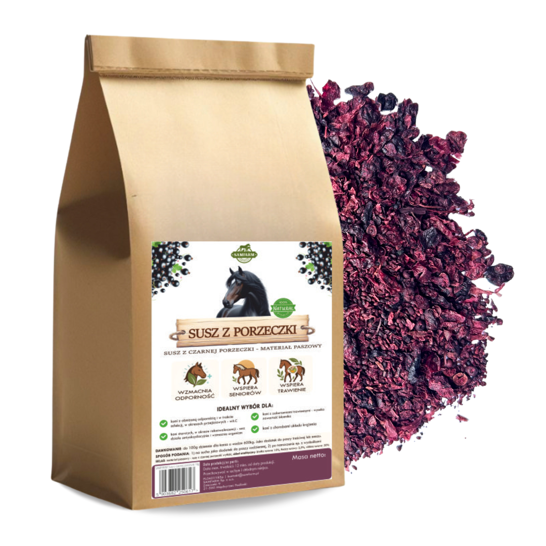 Susz z czarnej porzeczki ma intensywny, owocowy aromat i smak, który konie bardzo chętnie akceptują – sprawdzi się więc również jako sposób na zwiększenie atrakcyjności codziennej paszy. Jest to produkt w 100% naturalny, bez dodatków, barwników i konserwantów.