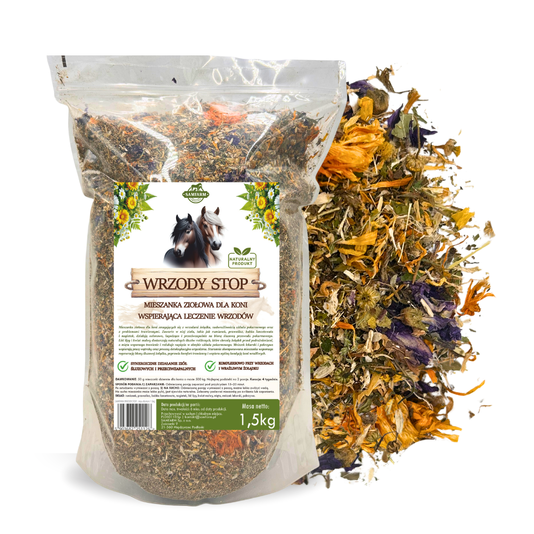 WRZODY STOP to mieszanka stworzona z myślą o koniach z problemami wrzodowymi, oparta wyłącznie na naturalnych, starannie dobranych surowcach roślinnych. Zioła o działaniu osłonowym, przeciwzapalnym i regenerującym błonę śluzową przewodu pokarmowego wspierają komfort żołądka, ułatwiają regenerację oraz łagodzą podrażnienia.