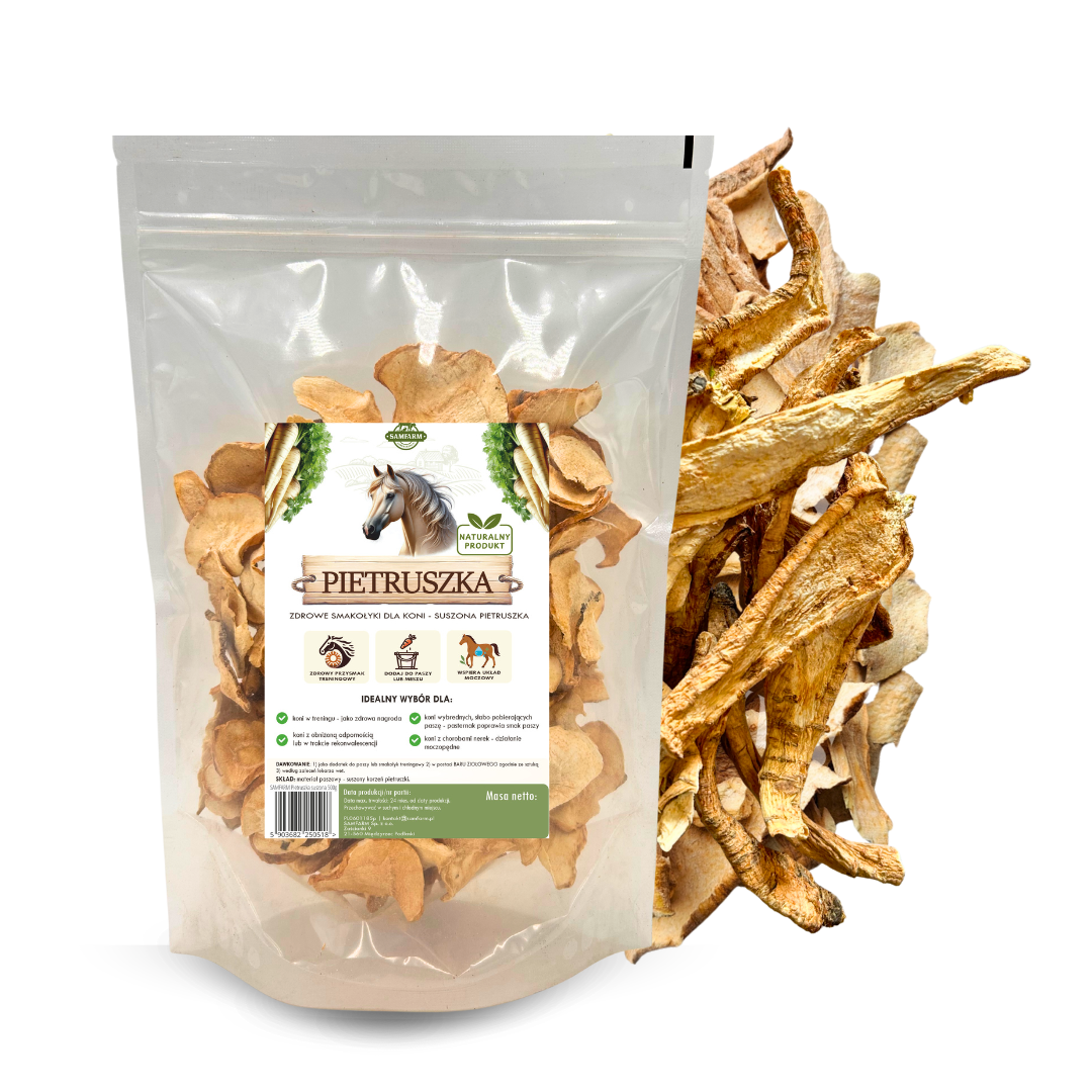 Suszona pietruszka dostarcza cennych składników odżywczych, działa wspomagająco na układ moczowy. Pietruszka poprawia smak paszy i pozytywnie wpływa na zwiększenie apetytu u koni, dlatego dobrze sprawdzi się u niejadków i koni wybrednych. Nasze smakołyki dla koni to zdrowa i nietucząca nagroda w treningu, a także wsparcie zdrowia Twojego konia. Pietruszka jest polecana do stosowania w diecie koni z chorobami układu moczowego, ponieważ wykazuje działanie moczopędne i antybakteryjne. Suszona pietruszka jest chrupiąca i aromatyczna, a konie ją uwielbiają. Zawiera wiele cennych witamin i soli mineralnych: potas, cynk, wapń, żelazo, kwas foliowy, miedź oraz witaminy C, K oraz A.